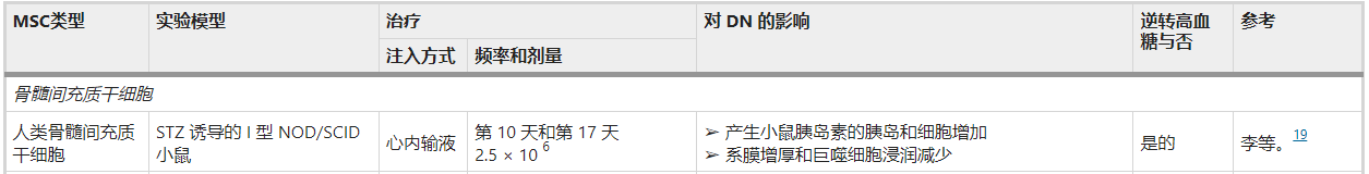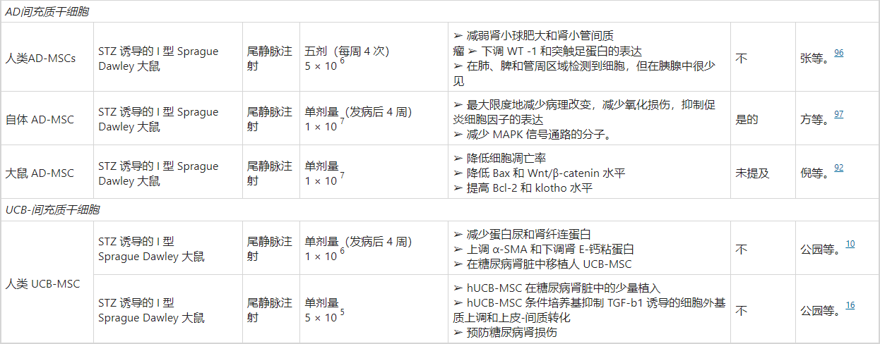 - 來自骨髓、脂肪組織和臍帶血的間充質干細胞在糖尿病腎病體內和體外都得到了廣泛研究。