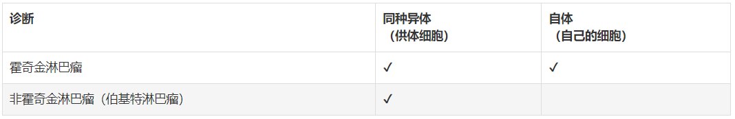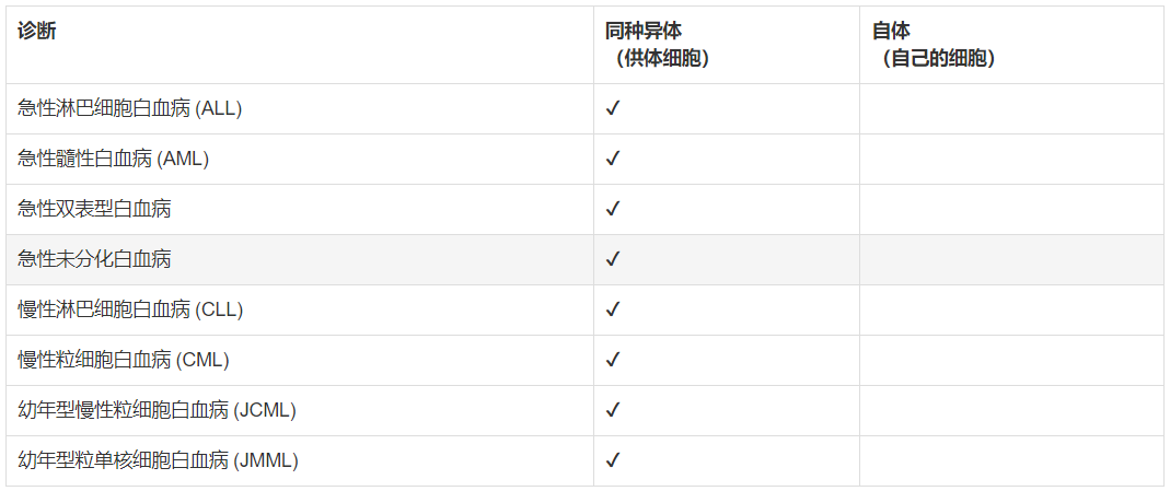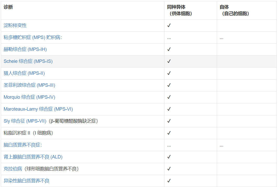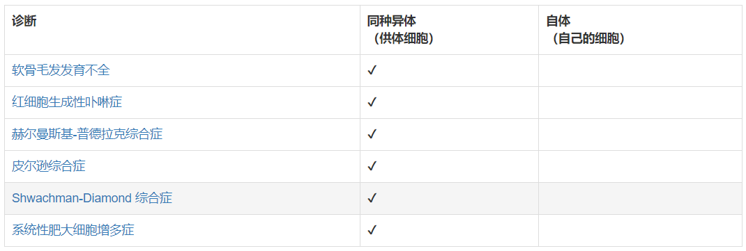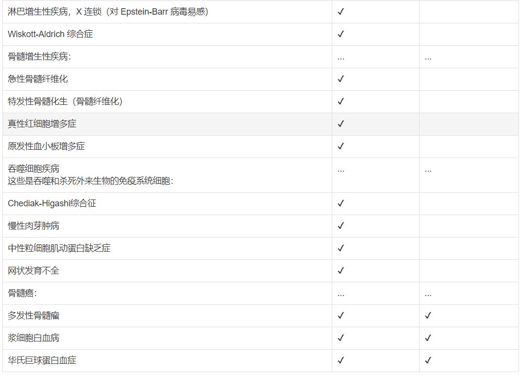 下面的列表包括所有使用造血干細(xì)胞的療法,不區(qū)分干細(xì)胞是從骨髓、外周血還是臍帶血中提取的。在美國,如果干細(xì)胞移植是患者診斷的“標(biāo)準(zhǔn)療法”,大多數(shù)健康保險提供商都會支付干細(xì)胞移植費(fèi)用。