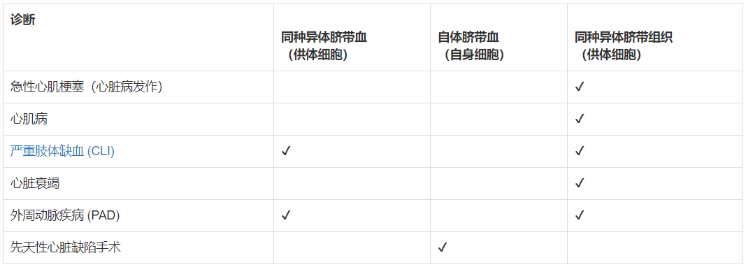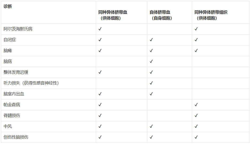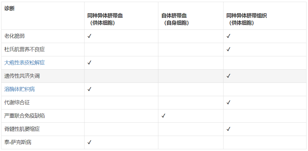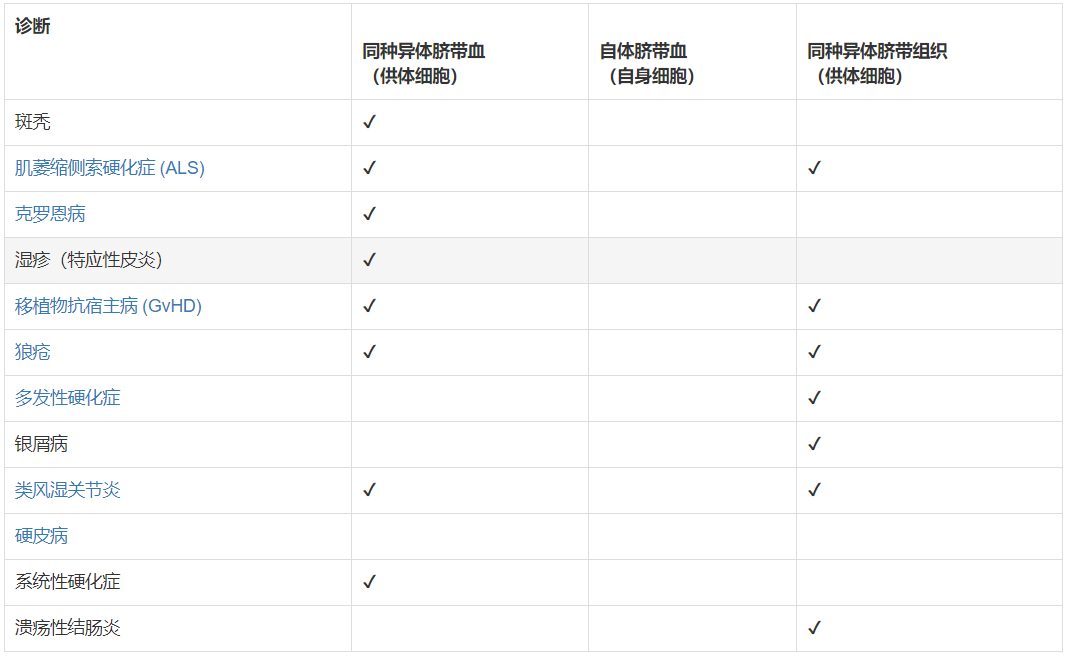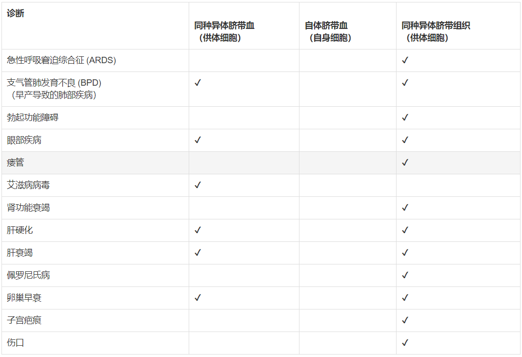 已在臍帶血或臍帶組織細(xì)胞臨床試驗中的疾病和病癥
