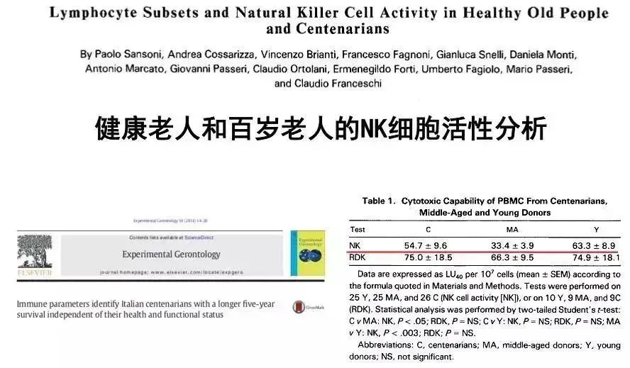有趣的是,百歲老人體內的NK細胞的殺傷活性仍高達55%,這說明長壽者體內的NK細胞殺傷活性更高。