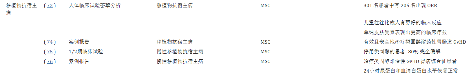 2004年勒布朗等人發(fā)表了第一份關于MSC治療GvHD的報告,具有良好的臨床反應。自第一個病例報告以來,已經進行了大量研究和試驗來評估MSC作為GvHD療法的功效。間充質干細胞治療GvHD被認為是安全的,不會造成任何重大的安全問題。同種異體MSC已用于大多數GvHD研究,其中骨髓是最常用的組織來源。