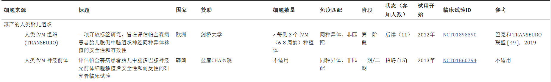 Lindvall等人于20世紀80年代初進行的開放標簽研究。首先表明,將從胎齡8-9周流產的人類胚胎中獲得的人類胎兒中腦多巴胺能神經元移植到PD患者的紋狀體中,可以在人腦中存活,并導致嚴重僵硬、運動遲緩、以及患者病情的波動。這可能是通過恢復紋狀體多巴胺能傳遞而發生的,揭示了使用胎兒組織進行細胞移植治療的前景