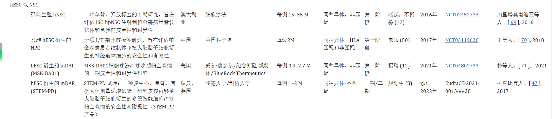 截至撰寫本文時,已有四項注冊臨床試驗使用 hESC 衍生的多巴胺細胞或人孤雌生殖神經干細胞作為移植治療的同種異體細胞來源(表格1)。其中,王等人于2017年啟動了第一個使用hESC的臨床試驗(NCT03119636)。基于最近的臨床前動物研究,美國Studer小組開展了一項1期臨床試驗,以確定同種異體WA09 hESC衍生的mDA祖細胞 (mDAP) (MSKDA01) 治療晚期PD患者的安全性和有效性 (NCT04802733)?。