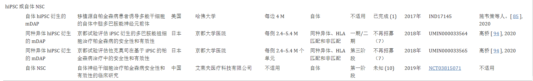其中,Schweitzer等人發表了一份開創性的病例報告。最近提出了自體細胞替代療法的里程碑,因為他們展示了源自PD患者特異性hiPSC (IND17145) 的mDAP自體移植的可行性。此外,另一項臨床試驗于2019年啟動,測試自體神經干細胞對PD患者施用的功效(NCT03815071)。