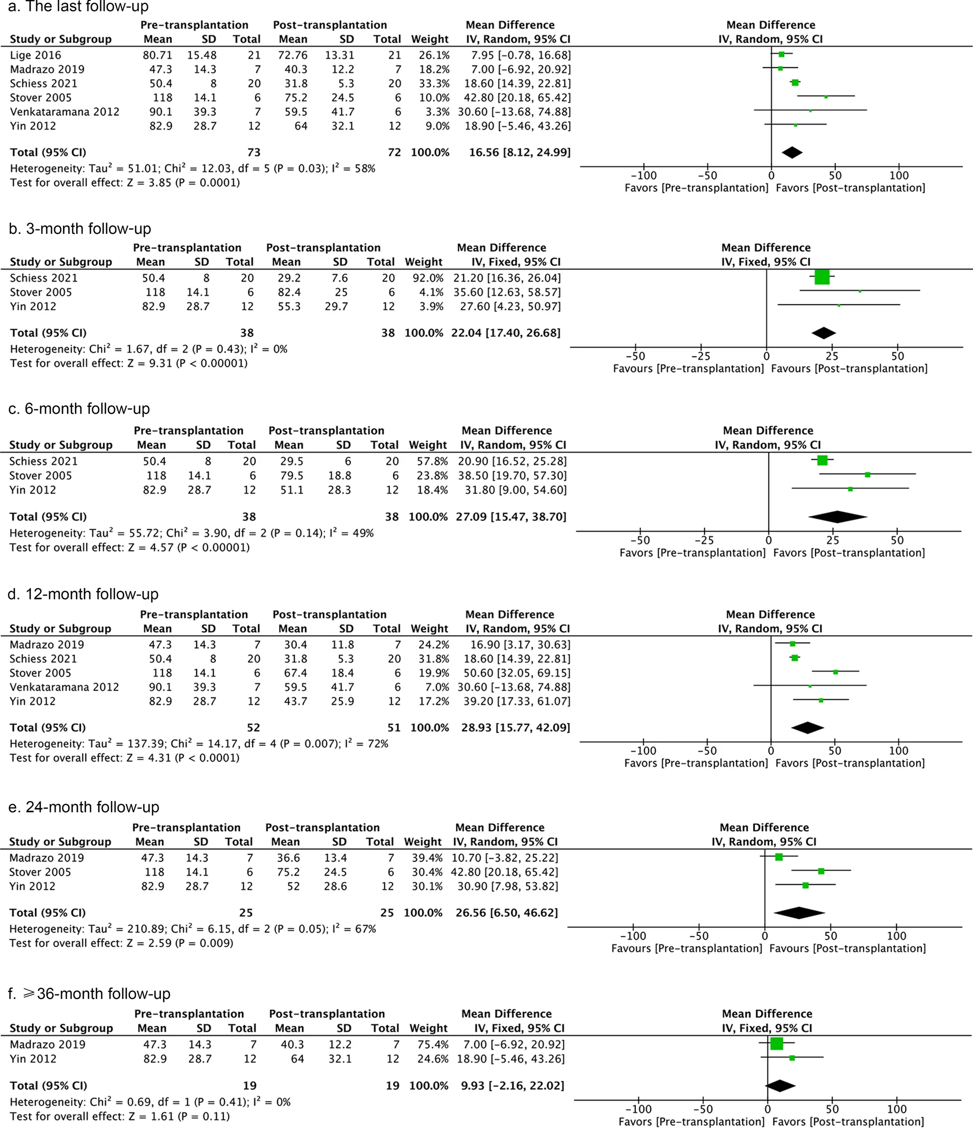 在3、6、12、24和≥36個(gè)月的隨訪中,對(duì)處于“關(guān)閉”狀態(tài)的細(xì)胞處理后的UPDRSIII評(píng)分進(jìn)行分析,結(jié)果顯示出積極的效果。分析“開啟”狀態(tài)下的UPDRSIII評(píng)分顯示,與基線狀態(tài)相比,干細(xì)胞治療在6個(gè)月和24個(gè)月的隨訪中具有有益效果,但在最后一次隨訪以及3個(gè)月或12個(gè)月的隨訪中都沒(méi)有效果(圖4)。最后一次隨訪以及3、6和24個(gè)月隨訪時(shí)研究間異質(zhì)性較低(圖4)。12個(gè)月的隨訪顯示出高度異質(zhì)性。