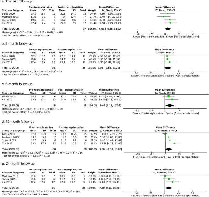 薈萃分析顯示,治療后與治療前相比,總體功能更好,但異質(zhì)性也很明顯。在最后一次隨訪以及3、6、12和24個(gè)月的隨訪中,同種細(xì)胞療法對(duì) “關(guān)閉 “狀態(tài)下的UPDRS評(píng)分產(chǎn)生了有益的影響,但在≥36個(gè)月的隨訪中沒(méi)有這種影響(圖2)。然而,只有兩項(xiàng)研究報(bào)告了后者(圖2)。在3個(gè)月、6個(gè)月和≥36個(gè)月的隨訪分析中,”關(guān)閉 “狀態(tài)下的UPDRS評(píng)分顯示出相對(duì)的同質(zhì)性(圖2)。此外,細(xì)胞治療改善了12個(gè)月隨訪時(shí) “開啟 “狀態(tài)下的UPDRS評(píng)分,但沒(méi)有改善最后一次隨訪或24個(gè)月、≥36個(gè)月隨訪時(shí)的評(píng)分(附加文件2:圖S2)。在12個(gè)月、24個(gè)月、≥36個(gè)月的隨訪中沒(méi)有明顯的異質(zhì)性,但在最后一次隨訪中卻有明顯的異質(zhì)性。這可能是由于不同的移植范例造成的。