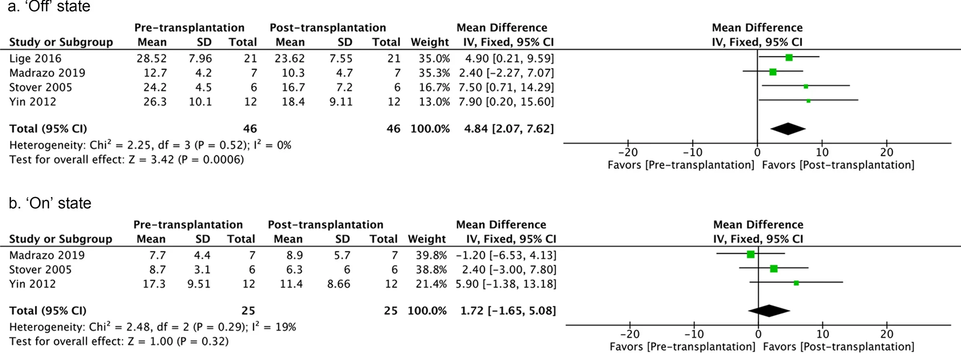 七項(xiàng)研究測(cè)量了干細(xì)胞療法對(duì)運(yùn)動(dòng)癥狀的影響。使用隨機(jī)效應(yīng)模型來(lái)比較研究最后一次隨訪時(shí)“關(guān)閉”狀態(tài)下治療前與治療后的UPDRSIII評(píng)分。細(xì)胞處理后薈萃分析得到了更好的結(jié)果,但異質(zhì)性很高(圖3)。