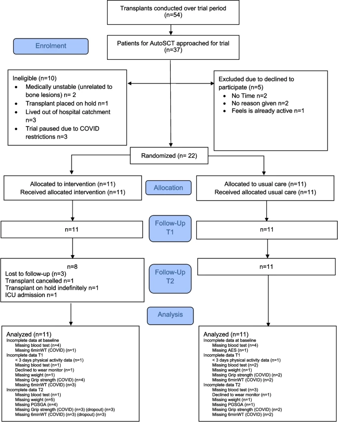參與者被隨機(jī)分配接受每周兩次、監(jiān)督的定制運(yùn)動(dòng)和每兩周一次的電話營養(yǎng)教育,最長持續(xù)8周,之后接受自體干細(xì)胞移植 (autoSCT??) 或常規(guī)護(hù)理 (?n=11)??。盲法評(píng)估分別在基線 (T0)、移植前 (T1) 和移植后4周 (T2) 進(jìn)行。