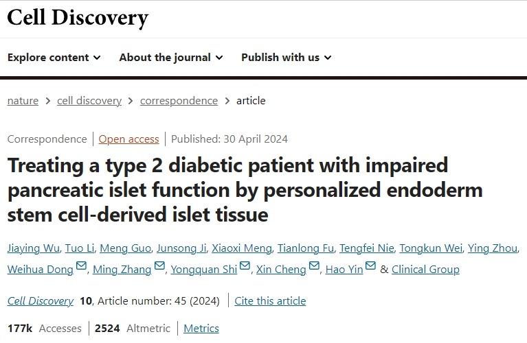 [3]:Wu, J., Li, T., Guo, M. et al. Treating a type 2 diabetic patient with impaired pancreatic islet function by personalized endoderm stem cell-derived islet tissue. Cell Discov 10, 45 (2024). https://doi.org/10.1038/s41421-024-00662-3