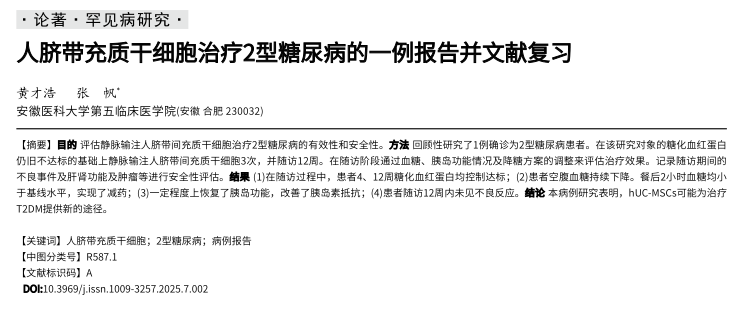 2025年7月25日,安徽醫(yī)科大學(xué)第五臨床醫(yī)學(xué)院在《罕少疾病雜志》上發(fā)表了一篇題為《人臍帶充質(zhì)干細(xì)胞治療2型糖尿病的一例報(bào)告并文獻(xiàn)復(fù)習(xí)》的研究報(bào)告,給廣大糖尿病患者帶了康復(fù)的新希望。[3]