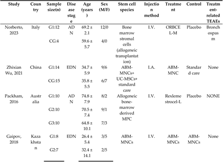 Norberto等人最近進行了一項1b/2a期多中心RCT,以評估成人同種異體骨髓基質干細胞移植對中重度DKD 患者的安全性、耐受性及治療效果。作者發現,18周的SCT導致估計腎小球濾過率(eGFR)顯著改善,但不影響尿微量白蛋白/肌酐比值(UACR)。然而,Gaipov等發現SCT顯著降低微量白蛋白尿(MAU),而不影響eGFR或血清肌酐(SCr)水平。