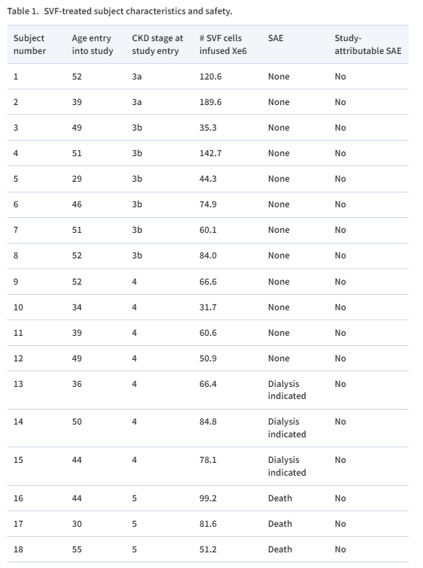 監(jiān)測(cè)三個(gè)階段的安全性:(1) 與侵入性操作相關(guān)的急性事件,(2) SFV 輸注后的急性全身反應(yīng),以及 (3) SVF 輸注后的長(zhǎng)期臨床事件。脂肪抽吸術(shù)、腎動(dòng)脈經(jīng)主動(dòng)脈導(dǎo)管插入術(shù)和 SVF 細(xì)胞輸注均已進(jìn)行,沒(méi)有因這些操作引起的不良事件。沒(méi)有注意到過(guò)敏反應(yīng)。