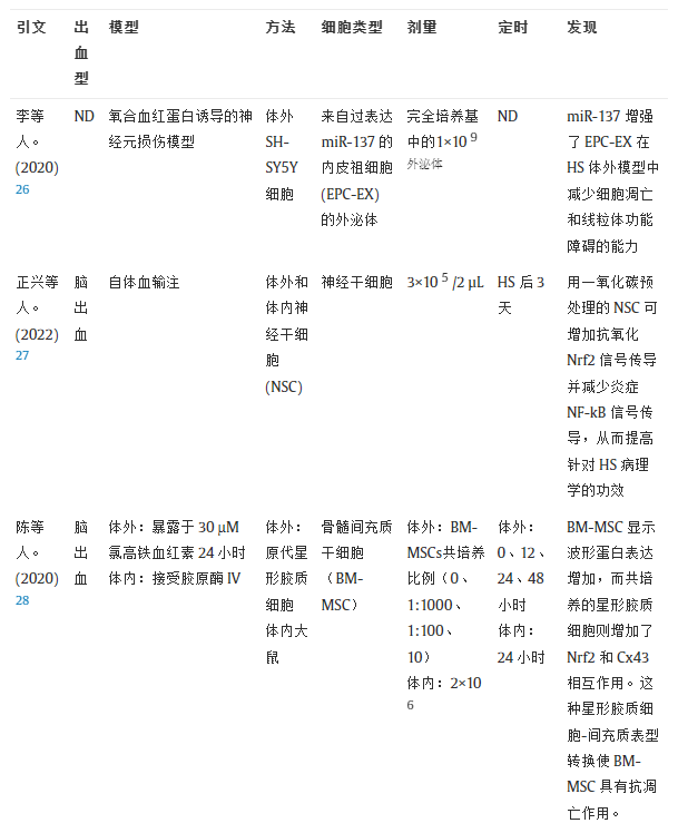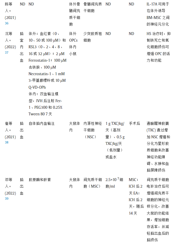 表1:該表舉例說明了有關(guān)使用干細胞治療出血性中風(fēng)的研究。(ND=未描述)。