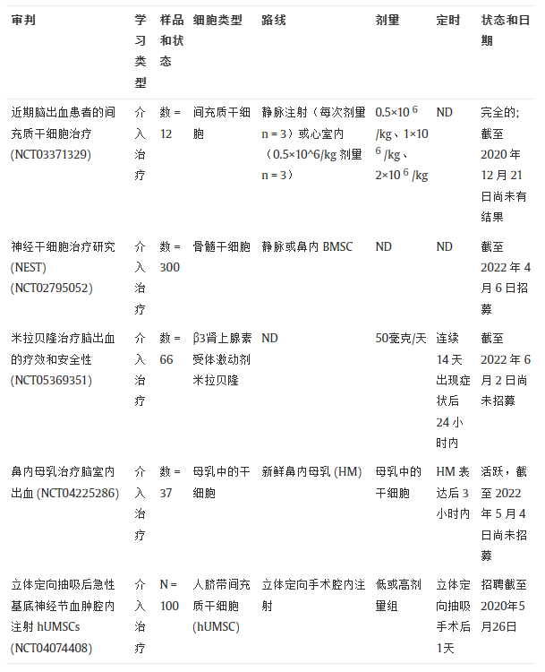 表2:該表舉例說明了2020年至2022年期間通過在ClinicalTrials.gov上搜索“出血性中風(fēng)”或“ICH”或“腦出血”和“干細胞”找到的臨床試驗更新。(ND=未描述)。