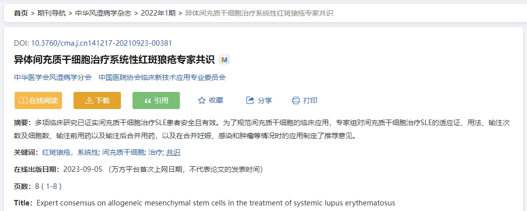 2022年,中華風(fēng)濕病學(xué)雜志發(fā)表了《異體間充質(zhì)干細(xì)胞治療系統(tǒng)性紅斑狼瘡專家共識(shí)》,文章概述了多項(xiàng)臨床研究已證實(shí)間充質(zhì)干細(xì)胞治療SLE患者安全且有效。為了規(guī)范間充質(zhì)干細(xì)胞的臨床應(yīng)用,專家組對(duì)間充質(zhì)干細(xì)胞治療SLE的適應(yīng)證、用法、輸注次數(shù)及細(xì)胞數(shù)、輸注前用藥以及輸注后合并用藥,以及在合并妊娠、感染和腫瘤等情況時(shí)的應(yīng)用制定了推薦意見(jiàn)。