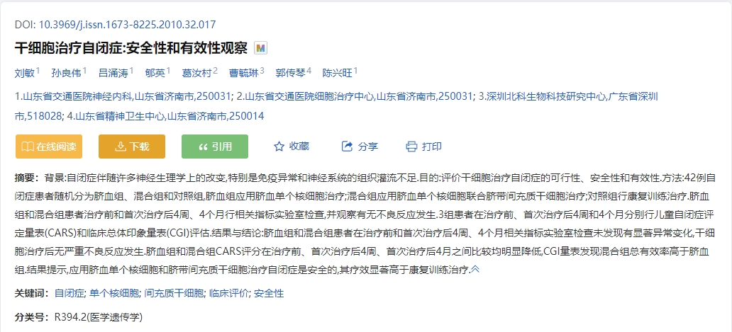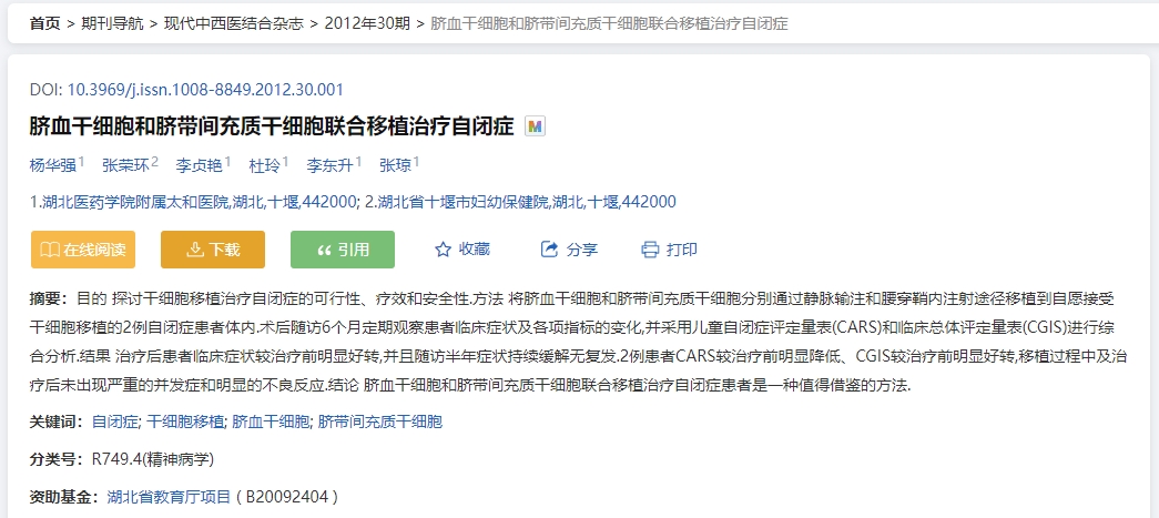 案例一:2010年,《中國組織工程研究與臨床康復(fù)》期刊雜志發(fā)表了一篇干細(xì)胞治療自閉癥:安全性和有效性觀察的臨床案例[1]。