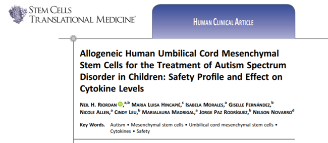 [5]:Neil H. Riordan, Maria Luisa Hincapié, Isabela Morales, Giselle Fernández, Nicole Allen, Cindy Leu, Marialaura Madrigal, Jorge Paz Rodríguez, Nelson Novarro, Allogeneic Human Umbilical Cord Mesenchymal Stem Cells for the Treatment of Autism Spectrum Disorder in Children: Safety Profile and Effect on Cytokine Levels, Stem Cells Translational Medicine, Volume 8, Issue 10, October 2019, Pages 1008–1016, https://doi.org/10.1002/sctm.19-0010