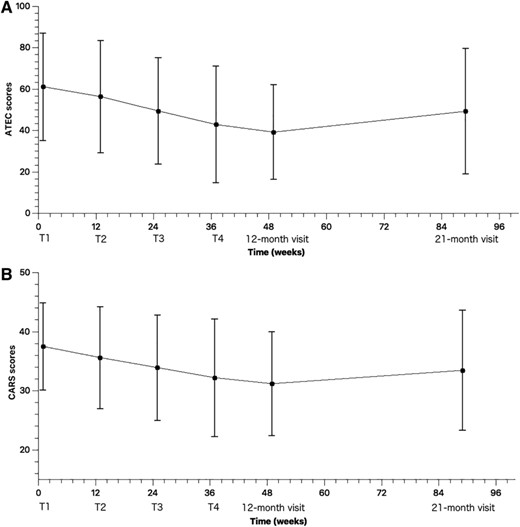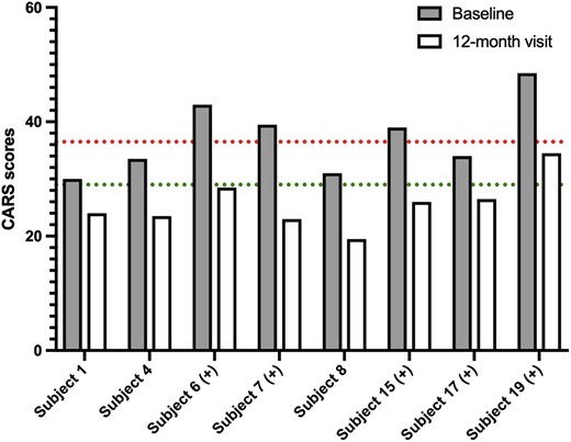 在基線和12個月訪問期間,八名參與者的兒童自閉癥評定量表 (CARS) 分?jǐn)?shù)有所改善。