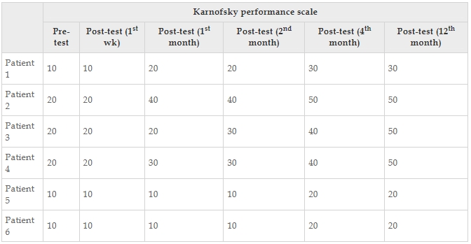 我們用來評估痙攣的MAS值在左側和右側均顯著下降。FIM量表包括運動得分和認知得分,并在前測后測分析中顯示顯著增加。干預前后參與者的卡氏能力量表值的差異具有統計學意義。