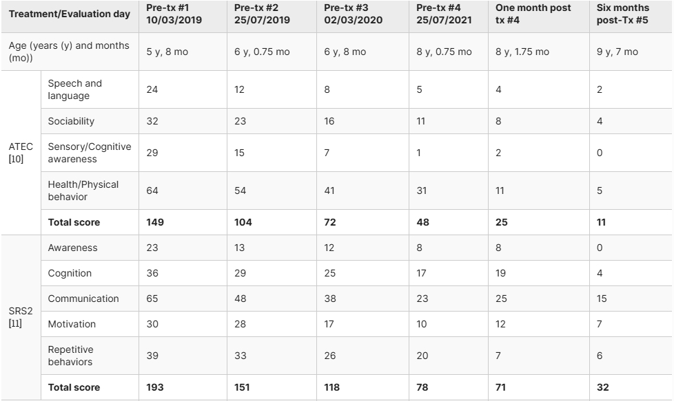 家長在知情同意的情況下同意讓患兒接受非親緣母嬰的靜脈注射異體間充質(zhì)基質(zhì)細胞移植(alloMSCT)(表1;附錄A、B)。在整個治療期間,患兒繼續(xù)接受相同的職業(yè)和交流治療。所有評估均由神經(jīng)病學和/或兒童發(fā)展專業(yè)的獨立兒科醫(yī)生在兒童發(fā)展研究所(隸屬于國家規(guī)定的健康基金)進行并記錄在案。