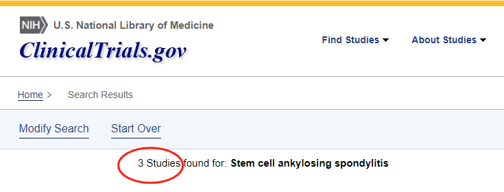 截止2022年11,在美國國立衛生研究院的最大臨床試驗注冊庫clinicaltrials.gov網站上注冊的有關干細胞治療強直性脊柱炎的臨床研究項目有3項。