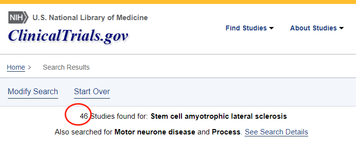 截止2022年11月,在美國國立衛(wèi)生研究院的最大臨床試驗注冊庫clinicaltrials.gov網(wǎng)站上注冊的有關(guān)干細(xì)胞治療漸凍癥的臨床研究項目有46項。