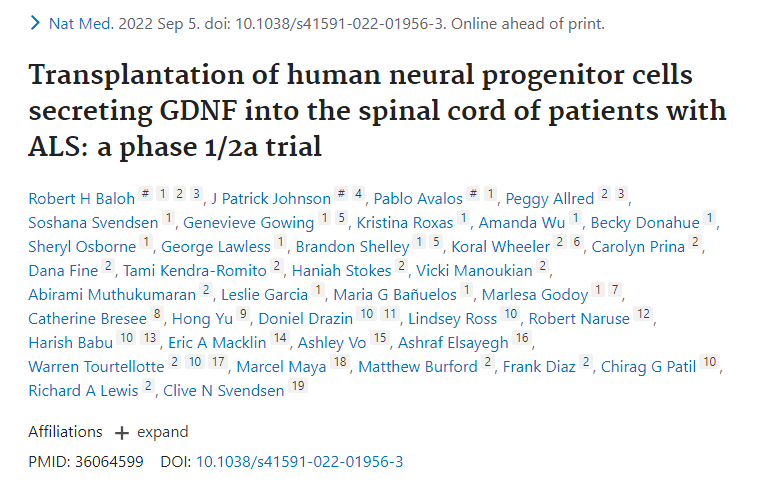 在1/2a期臨床研究(NCT02943850)中,CNS10-NPC-GDNF被移植到18名ALS參與者的腰椎中。主要安全性終點在1年時達(dá)到,與未治療腿相比,治療腿的移植對運動功能沒有負(fù)面影響。對死于疾病進(jìn)展的13名參與者的組織分析顯示移植物存活和GDNF產(chǎn)生。