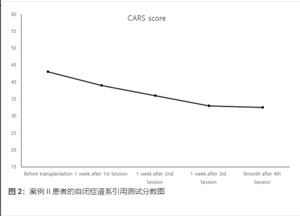 2019年11月至2020年1月進行臨床治療,選擇兒童自閉癥評定量表(CARS)評分>60分的兒童2例。從臍帶中分離出間充質干細胞。注射用細胞數為1×106/kg。該程序每周重復4~6次。
