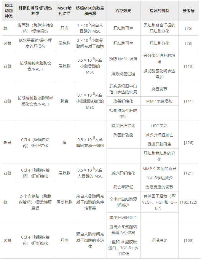 表2:使用間充質(zhì)干細(xì)胞或其衍生物治療肝損傷的臨床前研究。