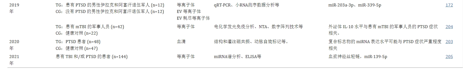 研究表明這些疾病可能具有相似的病理生理機制。盡管越來越多的新興研究關注EV相關miRNA和PTSD的其他生物標志物,但大多數研究結果仍需要進一步的臨床驗證。